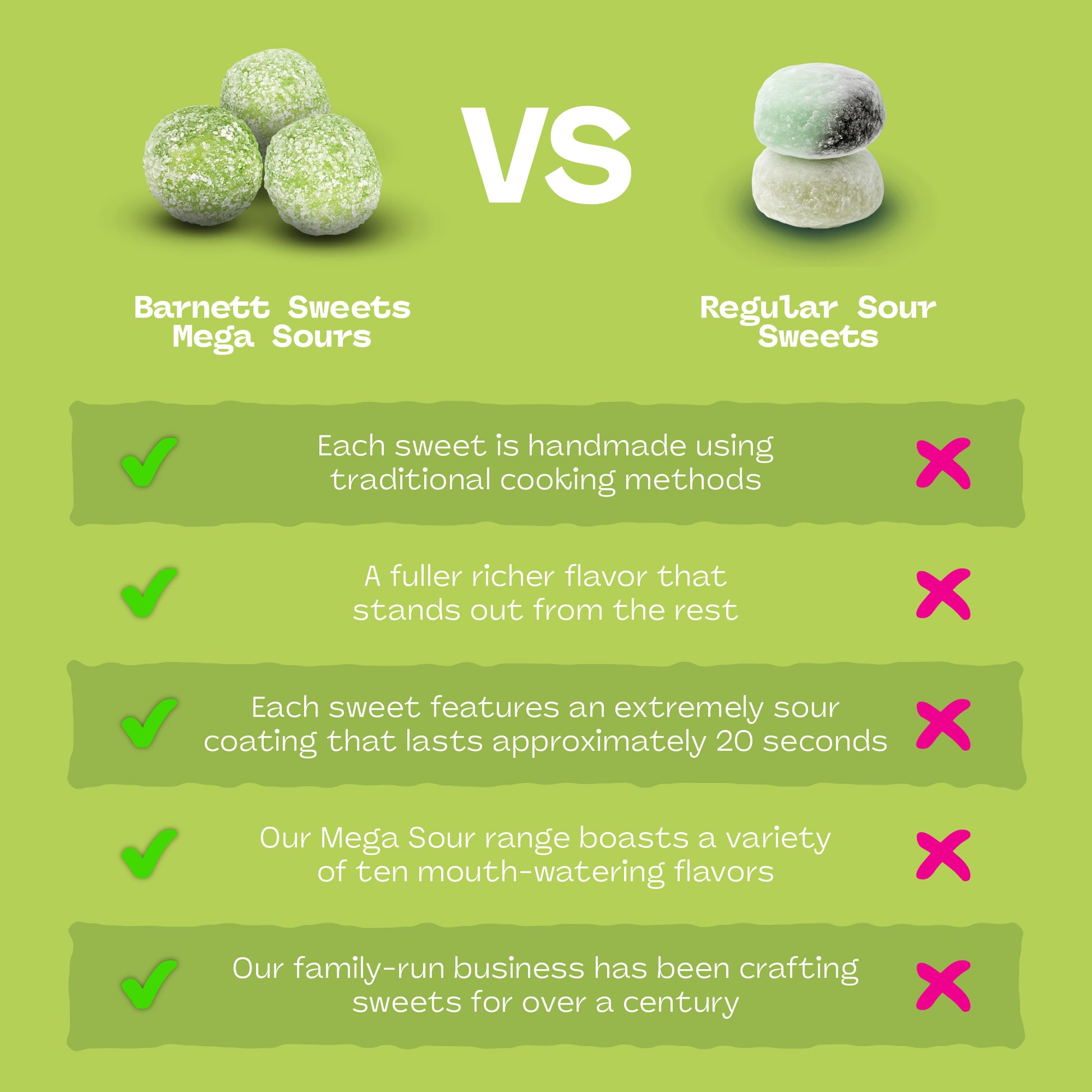 - Unmatched Sour Intensity: Known as the sourest candy in the world, Barnetts Mega Sour Apple delivers an electrifying burst of sourness that will leave your face puckered and your taste buds tingling.